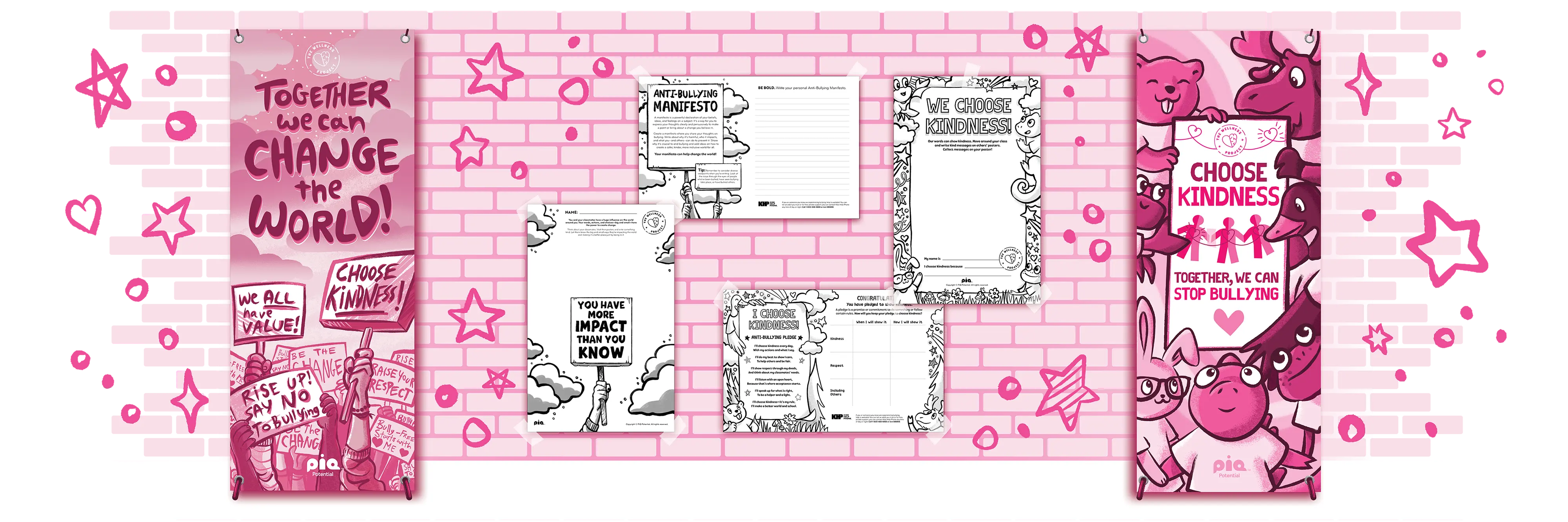 Lead up to Pink Shirt Day with thought-provoking illustrative banners. Display them around the school to build excitement and keep them up year-round as a lasting reminder.